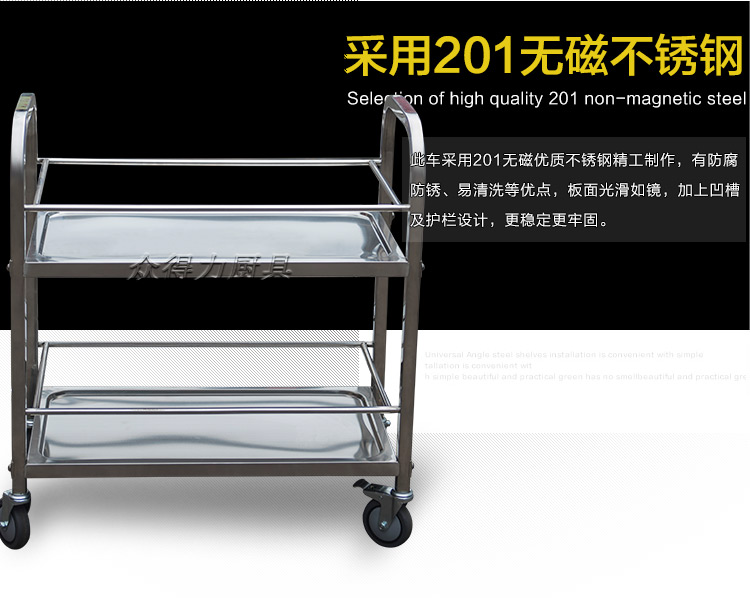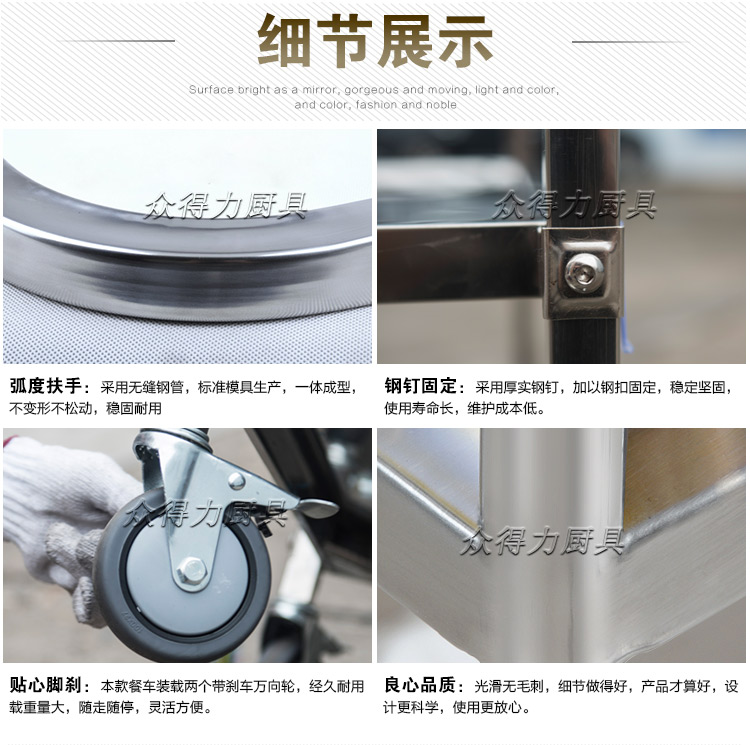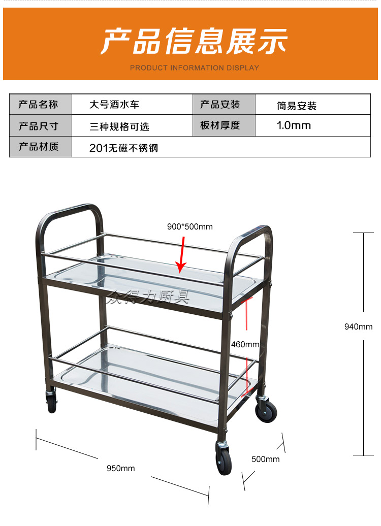 江西眾得力廚具有限公司生產銷售食品機械,商用廚具系列中央廚房設備,為客戶提供廚房整體解決方案。我司生產銷售的酒水車有大、中、小三種規格,采用201無磁不銹鋼設計。外形美觀大方,結實耐用。深受餐飲酒店客戶青睞