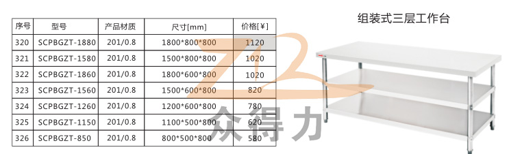 眾得力廚具為您提供中央廚房一站式服務,生產銷售食品機械、商用廚具系列設備,白鋼調理品,本操作臺有雙層和三層之分,且有1.5米和1.8米規格,均采用1mm標準板材加工設計,用料足