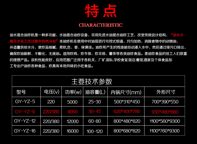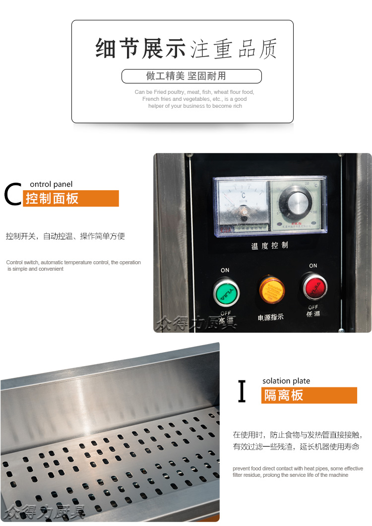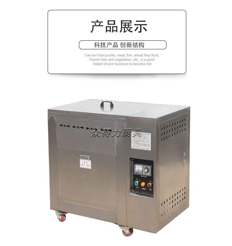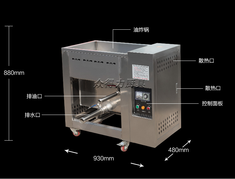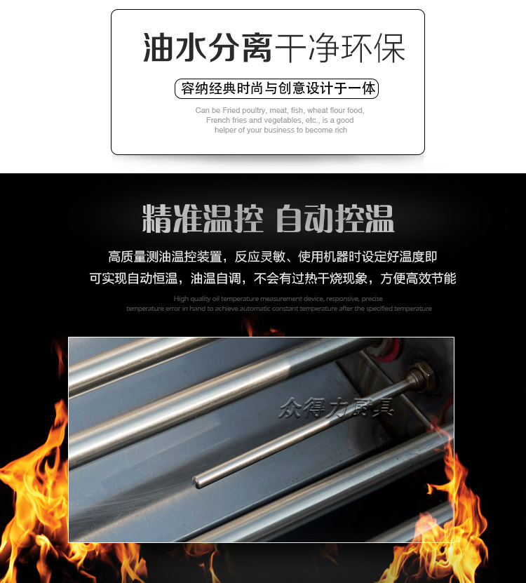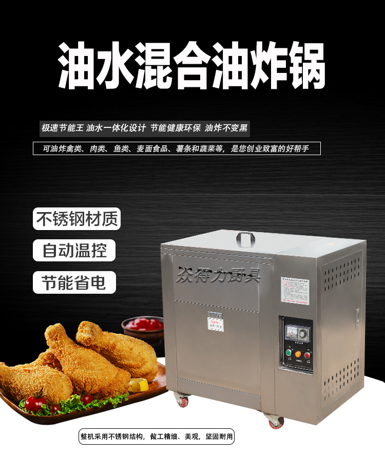 眾得力旗下產品油炸系列,不銹鋼電熱節能油水分離油炸爐,油炸機,YZ系列油炸爐,電加熱,節能油水分離油炸一體爐,油水過濾,確保油炸物能100%油炸,殘留物通過水過濾,拒絕一直油炸。油炸不變黑,炸出來的食品外形美觀