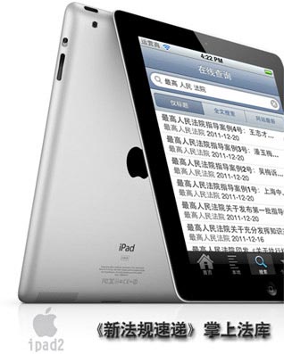 一臺預(yù)裝了《新法規(guī)速遞》軟件的蘋果/Apple iPad 2 wifi版16G,是您的掌上法律數(shù)據(jù)庫。
